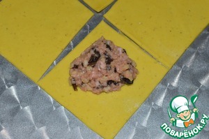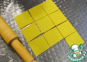 Тесто раскатываем в тонкий пласт. Нарезаем на квадраты со сторонами 6-7 см.