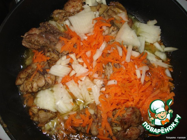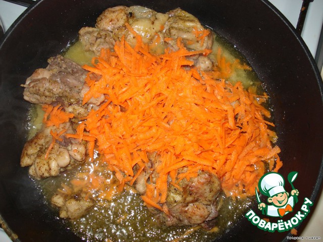 Натереть на крупной терке морковь и добавить к окорочкам.