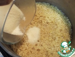 Затем в пшено, перемешивая ложкой, всыпаем манную крупу, и варим 12-15 мин. до загустения.