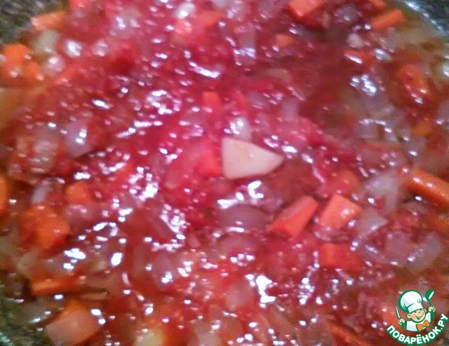 Когда лук и морковь прожарятся, добавляем томатную пасту, сахар и 200 мл воды. Накрываем крышкой и оставляем минут на 15-20 на медленном огне.