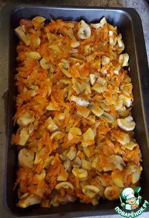 Пожарить лук, морковь и сырые грибы (у меня шампиньоны), посолить, поперчить.