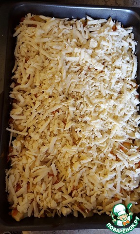 Покрыть тертым сыром. У меня российский.