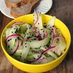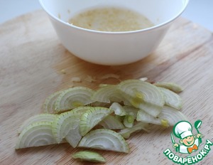 Лук почистить и нарезать тонкими полукольцами. Залить заправкой, перемешать и оставить мариноваться минимум на 1 час.