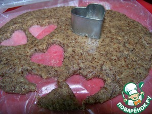 Вырезать формочкой сердечки. Оставшуюся массу вновь скатать в колобок и снова раскатать толщиной в 0,5 см. Продолжить вырезание сердечек.