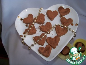 Готовые сердечки выложить на тарелку и посыпать какао-порошком. Готовые сердечки поставить в холодильник минут на 20. При желании сердечки можно покрыть шоколадной глазурью, это на Ваше усмотрение. Мне же нравится вариант с посыпкой какао.