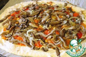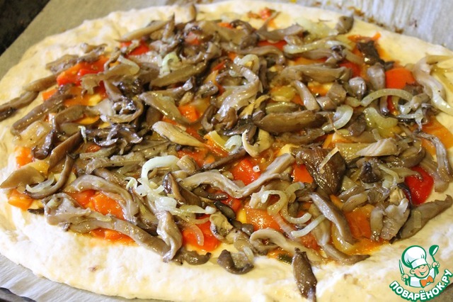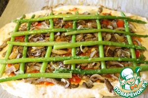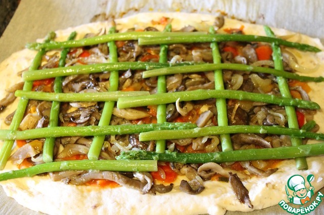 Оставшуюся часть теста также раскатать, сверху выложить лечо и грибы, обжаренные с луком.