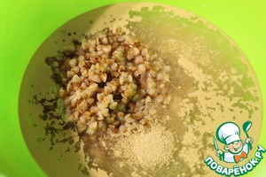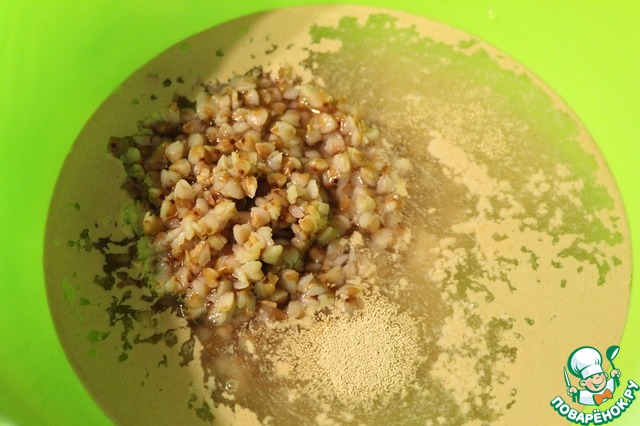 В миску налить теплую воду, добавить сахар, соль, дрожжи и гречку. Перемешать.