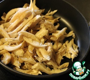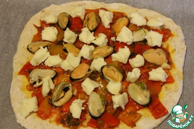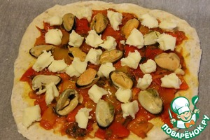 Далее разложить мидии и сыр, поломанный руками на кусочки. Выпекать в заранее разогретой до 190 градусов духовке, 20-30 минут.