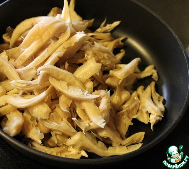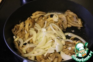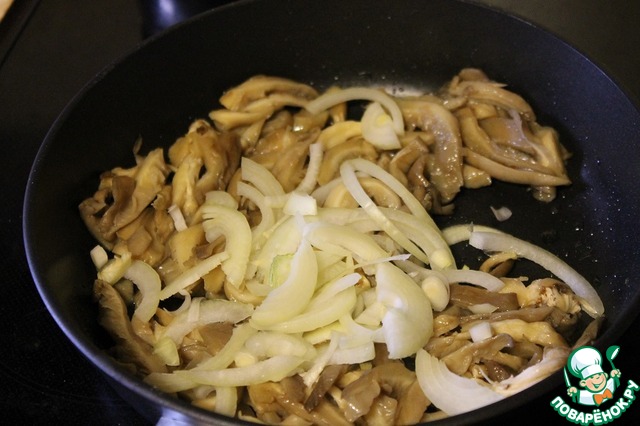 Как только выпарится вся жидкость, добавить лук, нарезанный полукольцами. Обжаривать все вместе до золотистого цвета.
