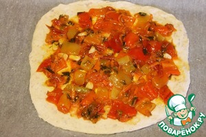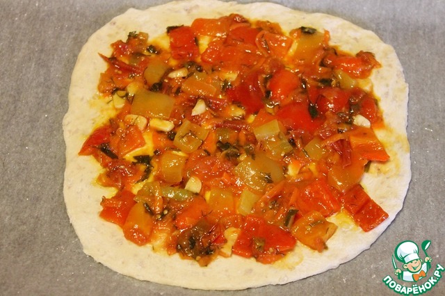 Раскатать одну часть теста в круг, сверху выложить лечо.