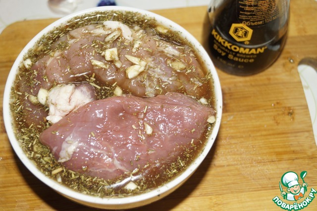Мясо промываем, обсушиваем бумажным полотенцем и укладываем в маринад. Закрываем крышкой и убираем на 24 часа в холодильник.