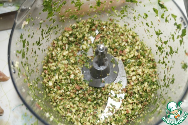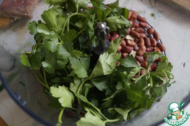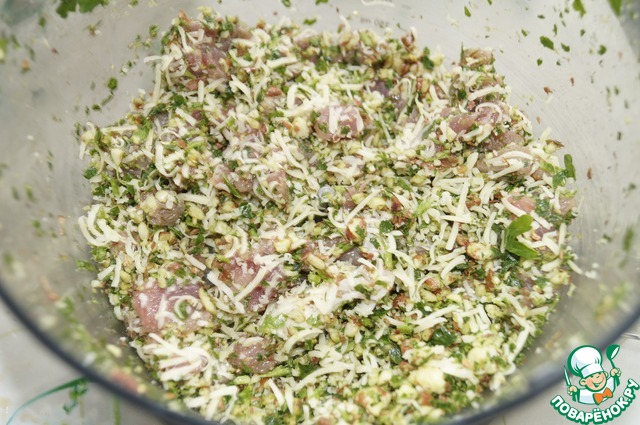 Через сутки готовим начинку. Для этого натираем на мелкой терке сыр. В чаше блендера мелко рубим арахис и зелень петрушки.