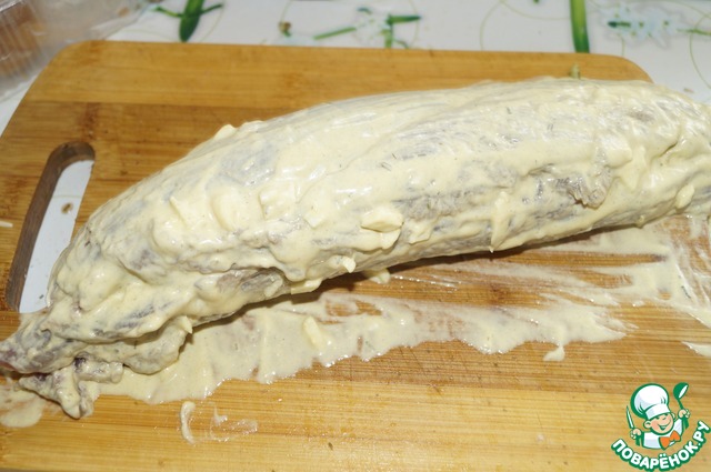 Для соуса смешиваем сметану, горчицу и рубленный чеснок, обмазываем рулет со всех сторон. Убираем в холод на пару часов.