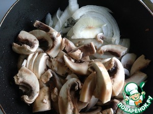 Лук нарезать полу кольцами, шампиньоны пластинками. Поставить обжаривать в растительном масле.