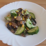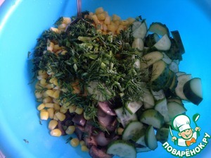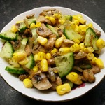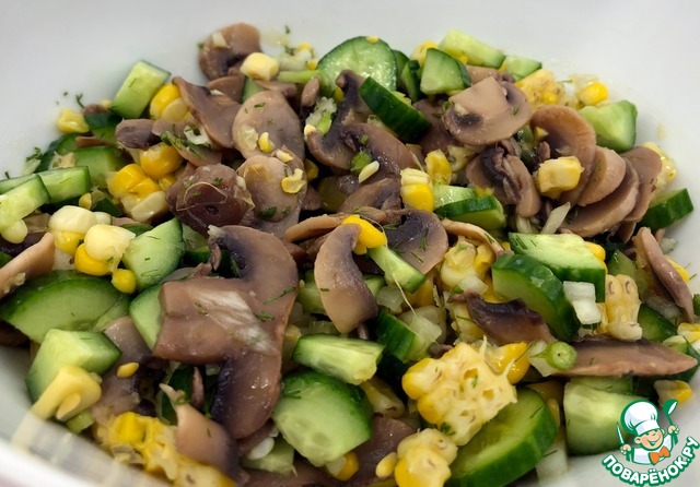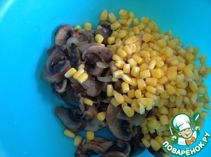 Остывшие грибы выложить в салатник вместе с кукурузой. Подсолить.