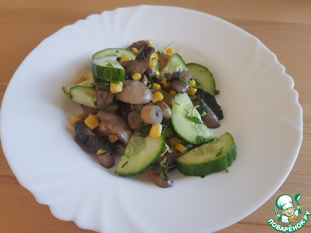 Вкусный, красивый салат с грибами и кукурузой. Совершенно аппетитный, доступный и не избитый. Угощайтесь!