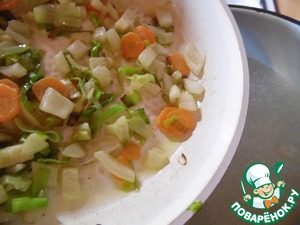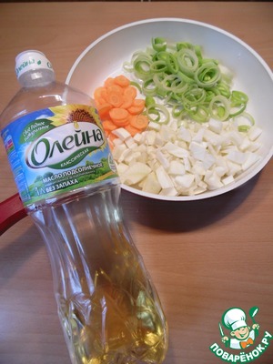 Лук нашинковать, морковь нарезать кружочками, лук-порей - колечками, фенхель нашинковать. Обжарить на растительном масле ТМ "Олейна" 5-7 минут.
