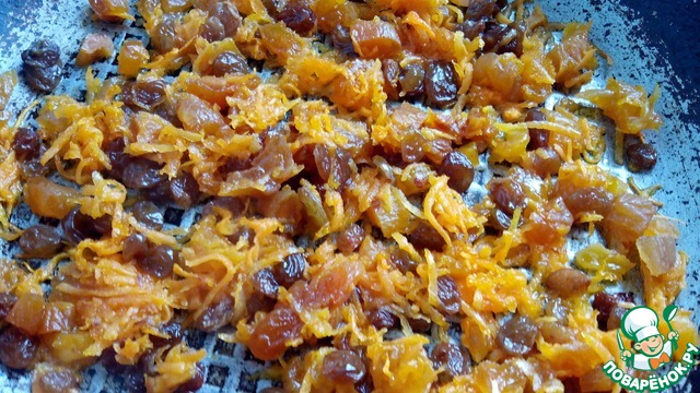 - промываем изюм, курагу режем кусочками и добавляем все к морковке;