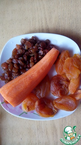 - подготавливаем продукты: морковь чистим, курагу и изюм промываем и заливаем горячей водой;