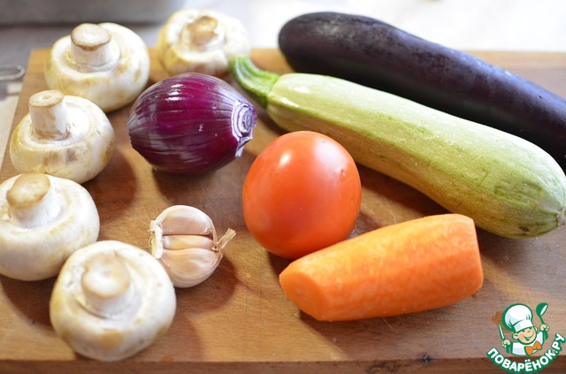 Нарезать кубиками помидор, баклажан, кабачок, лук, чеснок, морковь соломкой.