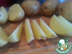 Отмыть картофель очень хорошо, потому что чистить его мы не будем. Разрезать картофелину пополам вдоль, потом ещё раз пополам и получившиеся четвертинки снова режем пополам. Таким образом, из каждой картофелины у нас получится по 8 долек.