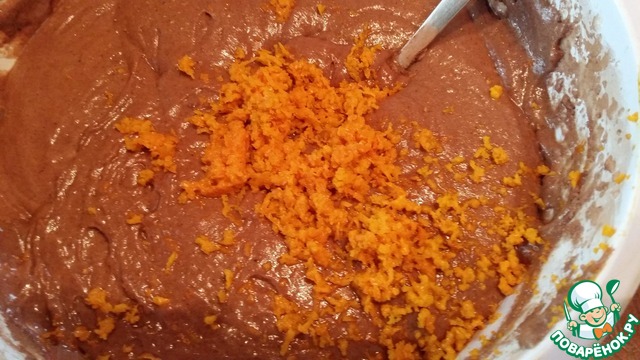 В яичную смесь добавить сметану, пряности, какао, муку, соду, гашенную уксусом и цедру 2 апельсинов. 1 ст. л. цедры можно оставить для крема. Муку я использовала обыкновенную высшего сорта.