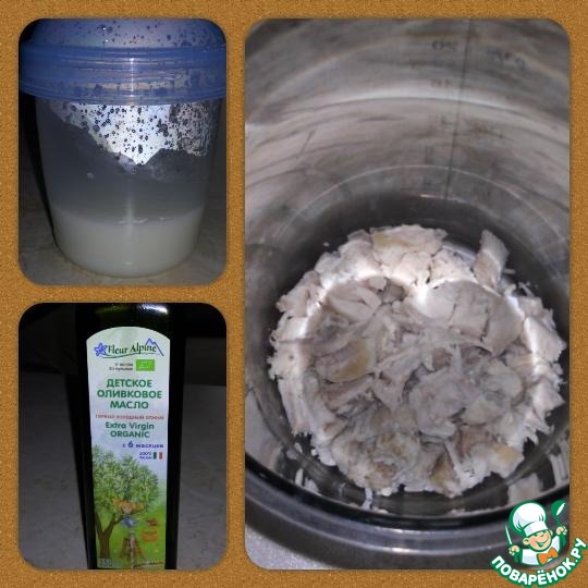 Далее измельченное мясо заливаем грудным (!) молоком/смесью/кипяч еной водой/овощным отваром и блендером измельчаем до консистенции однородного пюре. Добавляем также 5 мл оливкового масла холодного отжима. После года можно добавлять коровье или козье молоко. До года мясной бульон не рекомендуется давать малышу. Если используете грудное молоко, то после измельчения просто добавить к пюре овощи и можно кормить малыша сразу. А если это не грудное молоко, то полученное пюре доводим до кипения, а потом добавляем овощи и масло.