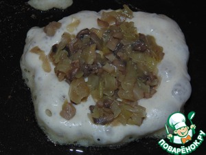 Сверху можно положить пластинку шампиньонов и чуть-чуть вдавить в тесто. Жарить на среднем огне с двух сторон.