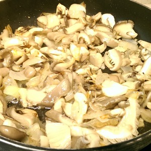 Обжарьте на растительном масле мелко нарезанный лук до прозрачности. Я использую масло подсолнечное "Олейна". Затем добавьте нарезанные так же мелко свежие грибы. У меня правда на этот раз вешенки. Жарьте до испарения жидкости с грибов.