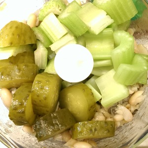 Добавьте к фасоли обжаренный грибы с луком, произвольно нарезанный сельдерей и соленый огурец. Пробейте минут 5 на большой скорости до состояния пюре.