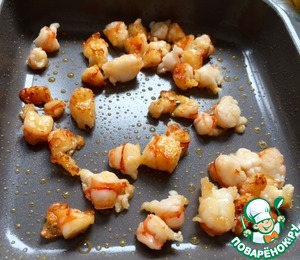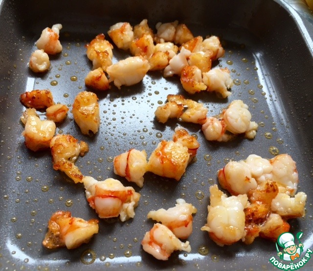 • Обжарьте нарезанные на небольшие кусочки креветки. На сливочном масле.
