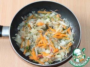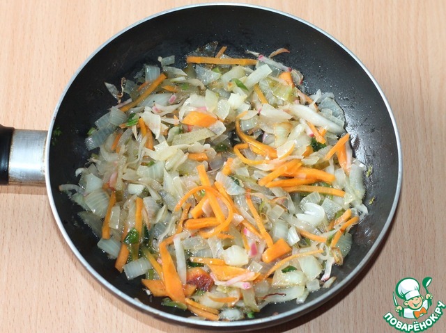 Репчатый лук очистить, порезать и обжарить на растительном масле до прозрачности. К луку добавить очищенную и мелко порезанную морковь, перемешать и тушить до готовности моркови. -