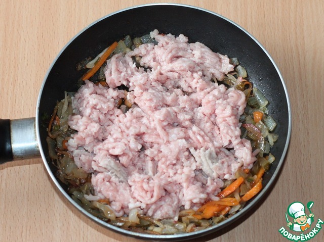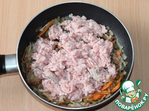 7. К пассеровке добавить мясной фарш, приправу, перемешать и готовить 2-3 минуты.
