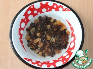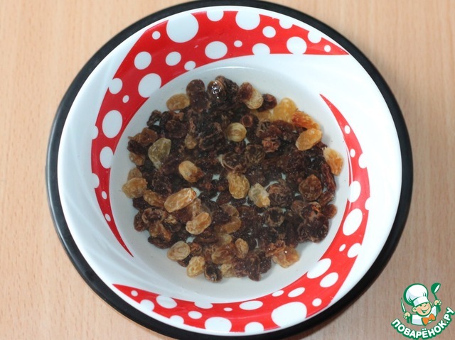 Заливаем изюм горячей водой и через 5 минут воду сливаем, изюм обсушить бумажным полотенцем.