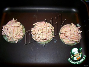 Ветчину нарезать полосочками и заправить майонезом и горчицей.