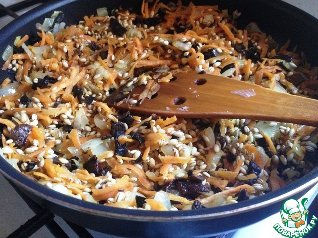 В сковороде разогреть растительное масло, выложить морковь и лук и спассеровать. Добавить нарезанные грибы. Готовить вместе 5 минут.