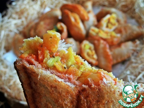 Прикрываем вторыми ломтями хлеба и жарим до готовности. Если нет бутербродницы, всё это можно проделать в сковороде с маслом, просто перевернуть потом бутерброд и жарить дальше.