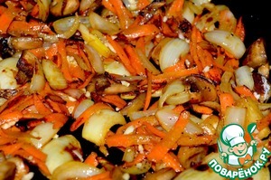 В сковороде разогреть растительное масло и обжарить грибы золотистого цвета, затем закинуть лук, обжаривать помешивая 2-3 минуты и закинуть морковь. Жарить все еще 5 минут, постоянно помешивая. Затем закинуть чеснок, посолить и поперчить по вкусу, перемешать.