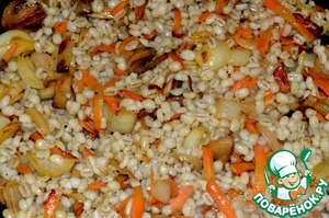 В сковороду к обжарке выложить перловку, перемешать и готовить пару минут. Выключить и дать постоять под крышкой 5 минут. В не постную порцию добавить фарш и перемешать.