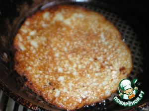 Когда одна сторона будет готова (легко отделяется от дна), перевернуть на другую сторону. Таким образом приготовить 5 блинов.