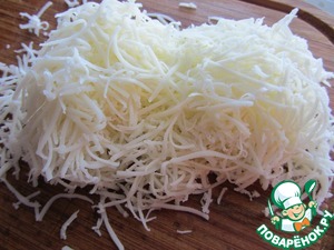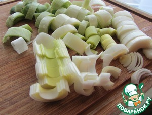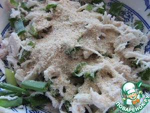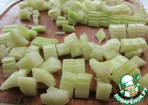 Грудку предварительно отварить и остудить. Нарезать небольшими кусочками. Половину грудки разобрать руками на волокна, а вторую половину оставим для не постной части супа.
