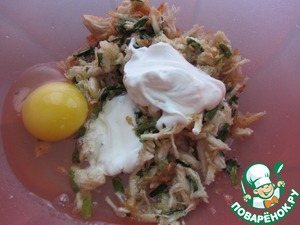 К получившемуся фаршу добавить соль, сметану, яйцо и перемешать.