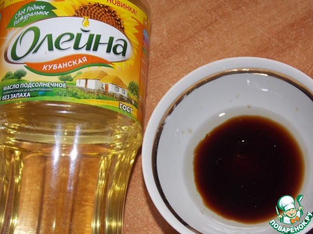 Смешать соевый соус, масло ТМ Олейна, уксус и сахар.