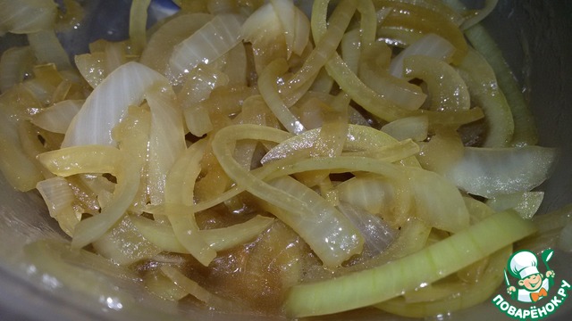 Залить маринадом лук, перемешать и оставить на 1 час (можно дольше).