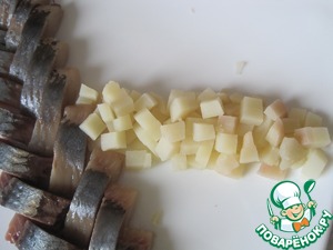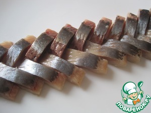 Сельдь разделываем на чистое филе и нарезаем толщиной 1 см. Укладываем посередине тарелки косичкой.