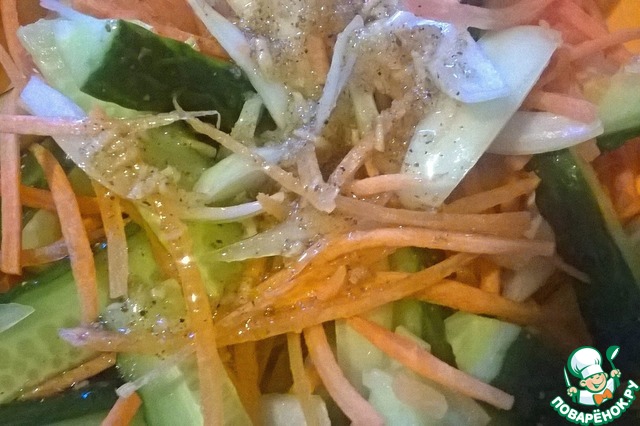 Овощи смешать и залить маринадом. Дать постоять минут 10.