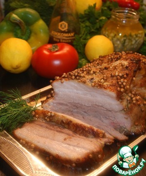 Мясо натереть лимонным соком, посыпать чесноком, посолить и поперчить со всех сторон, оставить при комнатной температуре на 1 час. Затем смазать горчицей и, поместив в емкость с крышкой, отправить в холодильник на 24 часа.