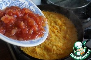 На разогретом растительном масле в глубокой сковороде под крышкой тушим овощи в течении 10 минут, затем добавляем томаты в собственном соку, перемешиваем и тушим еще 15 минут.