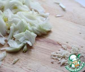 Лук нарезать тонкими полукольцами, залить на 10-15 минут холодной водой, промыть и тщательно отжать. Чеснок мелко нарезать.