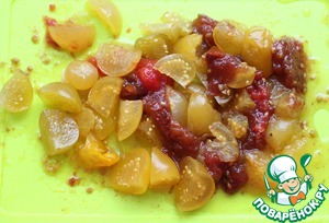 У консервированных помидоров снять кожицу и нарезать по возможности кубиками. Лишнему соку дать стечь.